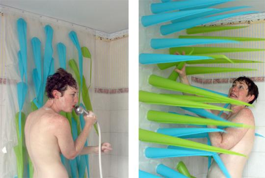 Textile-based installation artist and educator Elisabeth Buecher invented “Spiky,” as a clever way to help conserve water. Titled “My Shower is a Green Warrior,” the shower curtain turns spiky after four minutes in the water, “taking over the space and discouraging long water-wasting showers.”